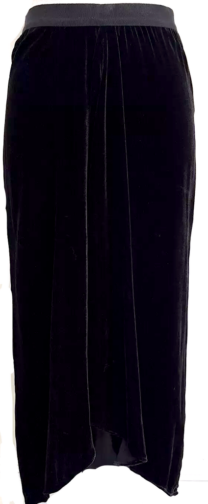 Elasticized waistband and asymmetric hem. Falls beautifully from waist.