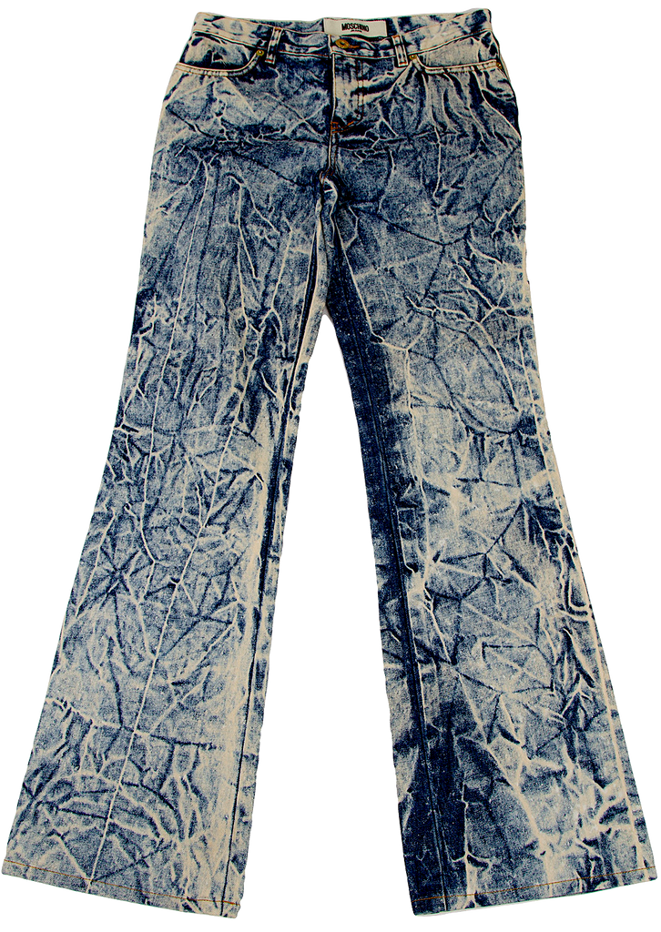 Moschino Italy. Indigo Chemical Wash Bootcut Jeans