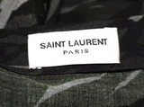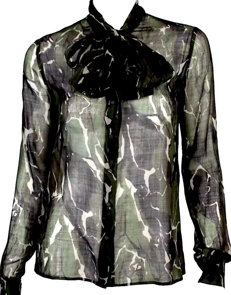 SAINT LAURENT PARIS. 2019 Collection Green & Black Camouflage Print Wool Sheer Pussy Bow Blouse