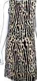 This dress is composed of black, golden beige, and off-white abstract textured jacquard fabric. It is lined in black fine textile fabric.