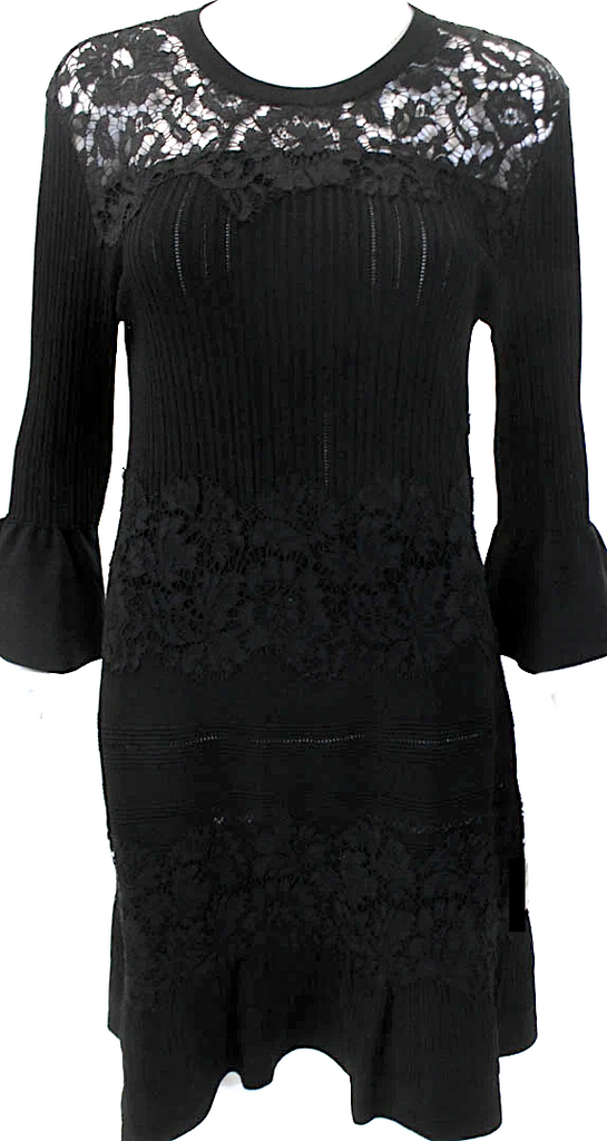 Valentino Garavani Italy Black Floral Lace Ribbed Crew Neck Bell Sleeve Dress